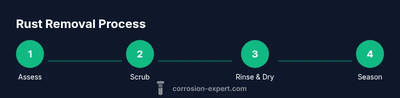 There are several methods to remove rust, from mechanical scrubbing to chemical rust converters. For light surface rust, start with dry scrubbing using a stiff nylon brush or steel wool if the surface can tolerate it. For moderate rust, you may use food-safe rust removers or a paste made from equal parts white vinegar and water; apply, let sit briefly, then scrub with a non-scratch pad. For heavy rust, a rust converter can stabilize iron and prevent further corrosion, but it is essential to follow the product’s instructions. Always work in a well-ventilated area and wear gloves and eye protection. After treatment, wipe the surface clean, rinse if the product allows, and dry thoroughly. The aim is to leave a clean, dry base for reseasoning rather than a wet surface that promotes renewed rust. Document what you remove so you can monitor ongoing rust risk over time. See references for visuals in the linked guide images.