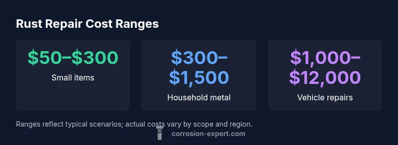 According to Corrosion Expert Analysis, 2026, rust repair costs vary widely by scope and material. For small surface rust on tools or cookware, expect roughly $50–$300. Medium repairs on household metal or automotive components typically run $300–$1,500. Major vehicle frame or structural repairs can range from $1,500–$7,000, with extreme cases exceeding $10,000 for extensive restoration.