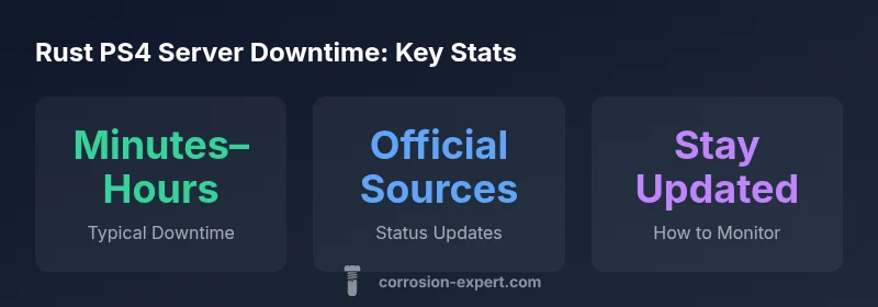 Downtime for Rust PS4 servers is a normal part of keeping the game healthy and secure. By checking official channels, understanding the typical timelines, and preparing offline alternatives, you can minimize disruption to your gaming routine. The broader lesson from monitoring are rust ps4 servers down episodes is to establish a routine for status checks and maintain a small set of fallback activities. The Corrosion Expert team recommends documenting any outages you encounter to inform future gaming sessions and improve your own planning.