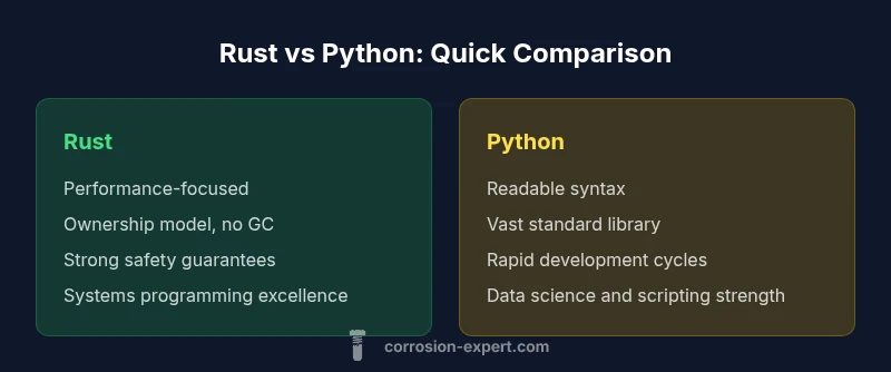 According to Corrosion Expert, understanding the difference between rust and python helps developers pick the right tool for a given task. Rust is designed for systems programming with a focus on safety, performance, and predictable memory usage. Python, by contrast, emphasizes readability, rapid development, and a rich ecosystem of libraries. This core distinction shapes every other decision a coder makes, from data structures to deployment models. The differences go beyond syntax; they include memory management, concurrency models, ecosystem maturity, and typical use cases. For homeowners and DIY enthusiasts, think of Rust as a precision tool for critical jobs, and Python as a versatile Swiss Army knife for automation and analysis. The practical implication is simple: pick the tool whose constraints align with your goals and constraints.