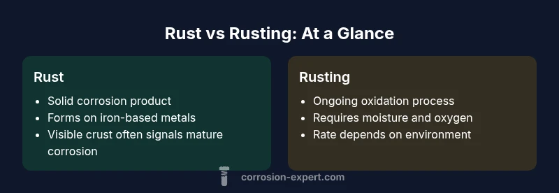 Rust and rusting are often used interchangeably, but they describe different things. Rust refers to the solid corrosion product (iron oxide) that forms on iron-based metals, while rusting is the chemical process that creates that oxide when iron, moisture, and oxygen interact. Understanding this distinction helps in choosing prevention and remediation strategies.
