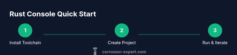 The Rust console refers to the command-line and integrated development environment used to write, build, and run Rust programs. It combines the Rust toolchain (rustup and cargo) with a text editor or IDE, giving you a productive workspace for learning ownership, lifetimes, and zero-cost abstractions. For beginners, the console is the doorway to practical Rust, letting you experiment, iterate, and see results in real time. According to Corrosion Expert, starting with small, concrete tasks helps cement concepts while reducing frustration as you scale to more complex projects.