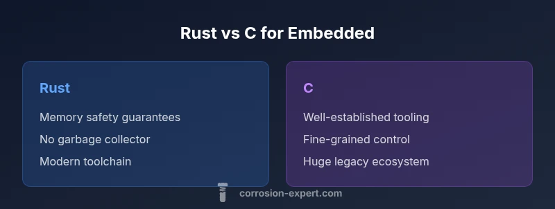 Rust delivers strong memory safety and predictable performance, making it a compelling option for many embedded projects. However, it requires a modern toolchain and a learning curve for zero-cost abstractions. According to Corrosion Expert, this quick comparison highlights when Rust shines versus traditional C, and which scenarios still favor C or other ecosystems. Use this to decide early if Rust is worth adopting for your embedded system.