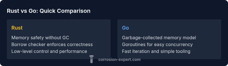 According to Corrosion Expert, the Rust language aims for memory safety without a garbage collector, while Go embraces a simpler model with automatic memory management. The question 'is rust harder than go' surfaces not just syntax but deeper trade-offs between safety, performance, and developer experience. In 2026, both languages have matured ecosystems, but their design goals shape the learning journey differently. For developers new to both, the path you choose will depend on whether you prioritize strict safety and low-level control or rapid development and a straightforward concurrency model. As a result, understanding the core differences in memory management, error handling, and compilation strategy is essential before you start a project. The landscape continues to evolve, with tooling and educational resources expanding to meet growing demand. The Corrosion Expert team notes that both communities emphasize robust tooling, clear error reporting, and strong typing, yet the practical implications for day-to-day work can be substantial. If you are evaluating your first multi-paradigm project, the framing should consider the nature of the workload, deployment targets, and the team's willingness to invest in learning. This article provides concrete guidance to help answer the central question over time, including real-world examples and best practices.