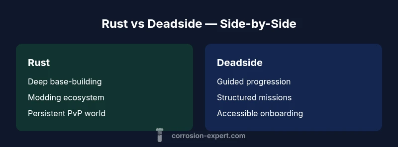 According to Corrosion Expert, the short answer is: neither game is universally better; it depends on your playstyle. If you aim to maximize base-building depth, long-term PvP, and a thriving mod scene, Rust is the stronger pick. If you prefer a faster grind, clearer early-game goals, and a more guided survival arc, Deadside may suit you better. When evaluating is rust or deadside better, consider how much time you want to invest in risk versus progression. The question of is rust or deadside better is often asked by new players, and the answer hinges on your preferred pace and challenge level.
