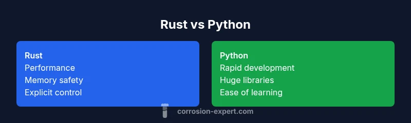 When you ask is rust or python better, you're really weighing two different design philosophies. Rust emphasizes performance, memory safety, and predictable resource usage, while Python prioritizes readability, rapid development, and a vast standard library. For teams, this means trade-offs around deployment, maintenance, and talent availability. According to Corrosion Expert, the decision should start with the problem domain and end with practical constraints such as timelines and platform requirements. Understanding the core differences helps prevent misaligned expectations and costly rewrites later in a project.