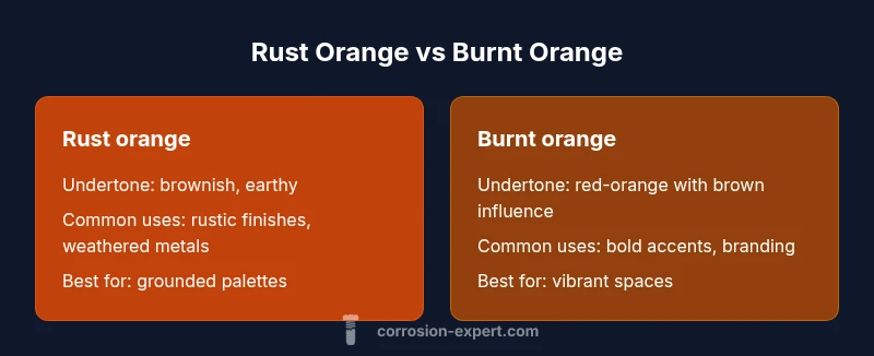 Rust orange is generally muted and brownish, while burnt orange is deeper and more saturated with red influence. Use test swatches in a real space to ensure the hue aligns with your lighting, materials, and overall palette. The Corrosion Expert team emphasizes practical testing and context to prevent color mismatches.