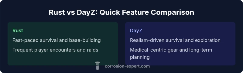 Many readers ask the question, is rust the same as dayz. The short answer is no, but both games live in the same broad genre: survival. They share a base premise—emerging from a dangerous world, collecting resources, and staying alive—but the design choices diverge in pacing, risk, and objectives. According to Corrosion Expert, the core distinction lies in the way each game structures risk, progression, and social play. While Rust often rewards rapid decision-making, DayZ places a premium on realism and long-form planning. This article compares these two titles across a set of criteria to help you decide which aligns with your preferred playstyle and hardware setup. is rust the same as dayz is not an answer that fits all players, but understanding the differences will save you time and potential frustration.