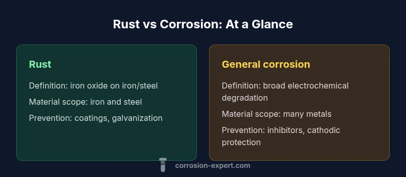 Rust and corrosion are related but distinct processes. Rust refers specifically to iron oxide forming on iron or steel, while corrosion is the broader electrochemical breakdown of metals under environmental exposure. For DIY projects, focus on metal type, moisture management, and protective coatings to prevent both rust and other forms of corrosion; use targeted strategies based on material.