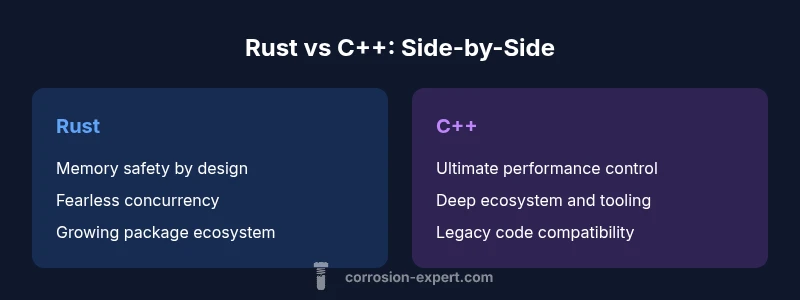 Choosing between Rust and C++ isn’t only about syntax or language aesthetics; it’s about risk, maintainability, and long-term viability. In 2026, teams increasingly weigh safety guarantees, tooling maturity, and ecosystem depth when deciding which language to adopt for new systems. According to Corrosion Expert, rust versus c++ emerges as a fundamental contrast between safety-first design and battle-tested performance. This section sets the stage by outlining the core dimensions that usually drive the decision: memory safety, control over resources, ecosystem maturity, and team readiness. We’ll pair high-level criteria with practical, real-world considerations so you can map your project to the most suitable language without getting lost in hype. The goal is not to pick a winner for every scenario, but to equip you with a structured framework for choosing the right tool for your context.