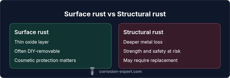 In everyday conversation, rust is a visible sign of metal decay, but for practical home projects the terms surface rust and structural rust identify two distinct levels of deterioration. According to Corrosion Expert, surface rust vs structural rust refers to the depth and impact of corrosion on the underlying metal. Surface rust describes a thin oxide layer that forms on the exterior of metal when moisture and oxygen meet. It is usually cosmetic and removable with routine cleaning, rust removers, and protective coatings. Structural rust, by contrast, indicates deeper deterioration where the metal has lost measurable thickness and strength. This can compromise safety and functionality, especially in load-bearing components or structural elements. The distinction matters because it guides remediation strategy: superficial rust often responds to DIY cleaning and sealing, while structural rust may require more extensive treatment, reinforcement, or replacement. In the pages that follow, we’ll break down signs, safe removal methods, and practical decision points for homeowners and hobbyists. Our goal is to help you assess risk accurately and act responsibly, protecting both value and safety without overreacting to every rust spot.