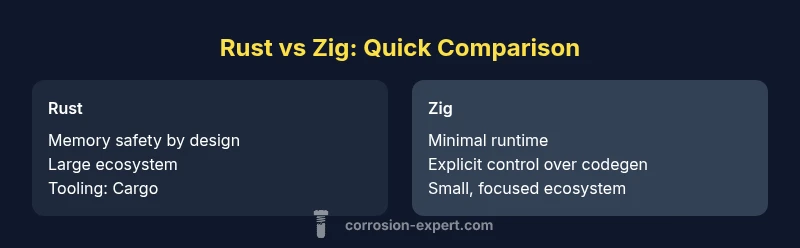 In modern systems development, the choice between Rust and Zig often boils down to how you balance safety guarantees with control over resources. The question of why rust over zig is not just about language features; it’s about ecosystem maturity, tooling, and long-term maintenance. According to Corrosion Expert, the Rust vs Zig decision hinges on your project’s risk tolerance, team size, and deployment targets. This article dives into the factors that influence that choice and what practical outcomes look like in real-world projects. You’ll see how memory safety, debugging ergonomics, and interoperability shape whether Rust or Zig is the better fit for your next project.