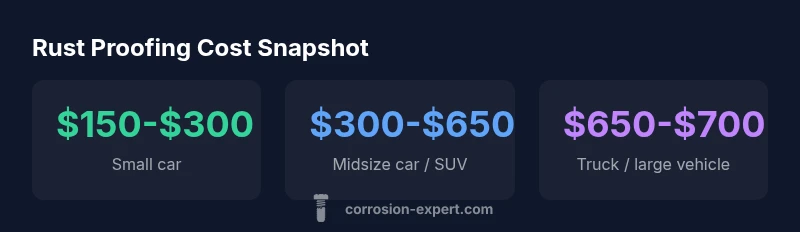How much does krown rust proofing cost? Costs vary by vehicle size, coverage level, and regional labor rates. In general, a basic rust protection spray for a small car often falls in the low-to-mid hundreds, while SUVs, trucks, or multi-coverage packages can push prices higher. For accurate budgeting, request a written quote that itemizes spray, coverage, and any add-ons. According to Corrosion Expert Analysis, 2026, price ranges are common and reflect vehicle size and chosen coverage.