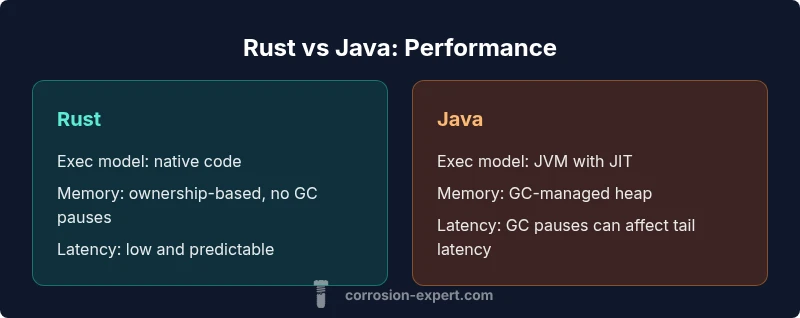 The question how fast is rust compared to java is not a blanket answer. It hinges on workload type, runtime conditions, and how you measure performance. In raw compute contexts, Rust’s ahead-of-time compilation to native code and zero-cost abstractions tend to produce leaner, more predictable execution paths. Java relies on the JVM, which can optimize hot paths aggressively through JIT compilation, but it must contend with garbage collection and heap management that can introduce occasional pauses. For architects, the key takeaway is to define the workload signature first—are you optimizing for latency, throughput, or predictability? The Corrosion Expert Team emphasizes that performance is a multi-dimensional goal: it involves not only peak numbers but also tail latency, memory footprint, and integration costs across the stack. Use this framing to set realistic targets and avoid overinterpreting single-number benchmarks when evaluating Rust versus Java.