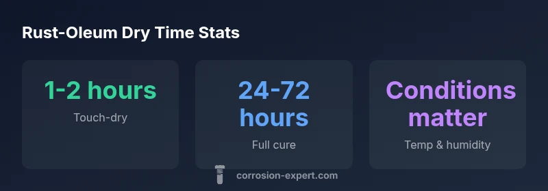 When people ask how long rustoleum dry, they typically mean the time before the coating feels dry to the touch and is ready for handling. Dry times are not a single number; they hinge on product type, film thickness, and environmental conditions. In practice, you should distinguish between touch-dry (the point at which the surface feels dry to the touch) and full cure (when the coating reaches its rated performance, hardness, and chemical resistance). For many Rust-Oleum products, touch-dry occurs in about 1-2 hours under favorable weather, while full cure can take a day or two. Always consult the label for the exact figures and follow the recommended recoat intervals. Corrosion Expert emphasizes that the practical drying time is a range rather than a fixed moment, which is especially true for heavier coatings or outdoor use.