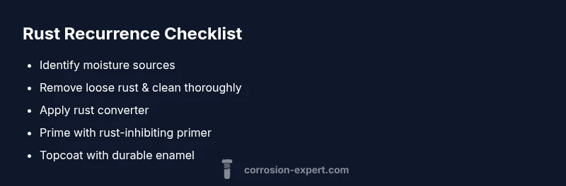 Discover practical steps to diagnose and stop rust from reappearing after treatment. This Corrosion Expert guide covers causes, fixes, repair workflow, and prevention tips for DIY homeowners.