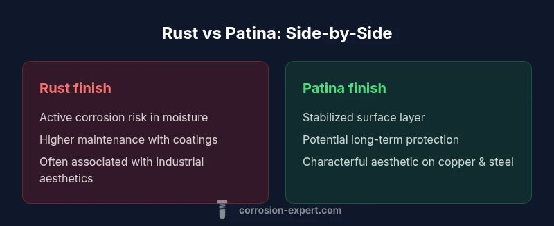 wordCount":210},"bodyBlocks":["## Aesthetics and perception: when appearance drives decisions\nAppearance matters as much as chemistry in many DIY projects. Rust brings a warm, earthy palette—orange-brown hues with rough texture—often associated with industrial character. Patina provides a controlled aging look: a smooth, varied patina sheen on copper can range from turquoise to blackened olive, while iron patina may present grey-brown tones with a protective crust. From a design perspective, patina is frequently chosen for authenticity in historical pieces or outdoor sculpture, whereas rust is sometimes embraced for rustic vibes. According to Corrosion Expert analysis, the decision hinges on whether the goal is a deliberate antiqued look or a maintenance-friendly surface. The aesthetic choice also influences perceived value and compatibility with surrounding materials.\n\nPractical tip: test a small area to compare the patina’s color shift with the surrounding element before committing to a full finish. Brand-driven guidance suggests documenting your project’s intended lifecycle to ensure the finish aligns with long-term goals."