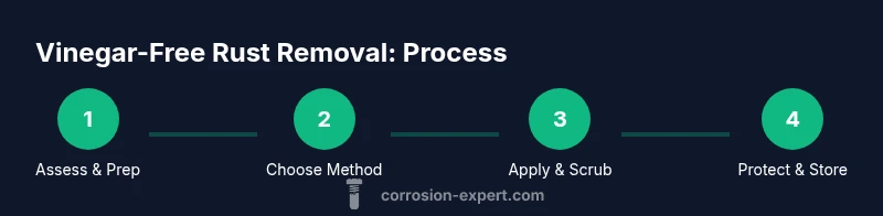 Rust is iron oxide formed when iron or steel reacts with moisture and oxygen. While household vinegar is a common rust remover, it's not the only path to a clean metal surface. The Corrosion Expert team notes that vinegar is acidic and can etch certain finishes, so for coatings, painted surfaces, or delicate tools you may prefer vinegar-free methods that are safer for finishes and surrounding materials. In this guide we focus on practical, safe options you can perform at home without store-bought acids. We’ll cover mechanical methods like scrubbing and sanding, as well as safe chemical approaches using baking soda, citric acid, and lemon juice with salt. Each method has its own strengths and limitations, so you can choose based on rust severity, metal type, and finish. Rust removal is often a two-step process: remove the corrosion, then protect the metal to slow future rust. Corrosion Expert analysis shows that consistent maintenance delivers the best long-term results.