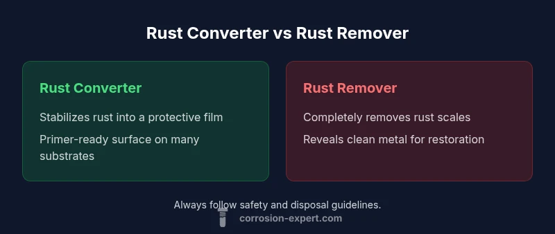 According to Corrosion Expert, choosing between rust converter vs rust remover depends on rust severity, surface prep, and finish goals. This comparison clarifies how each product works, when to choose them, and how to pair them with primers for long-lasting protection. For DIYers, understanding the difference helps save time and avoid costly rework. The article also highlights practical tips and safety considerations.