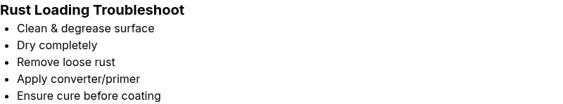 The most likely cause is inadequate surface prep or using an incompatible primer, which prevents the coating from loading properly. Start with a thorough clean, degrease, dry surface, then abrade the rust, remove loose scale, and apply a compatible rust converter or primer in thin, even coats. If loading still fails, test adhesion on a small area first.