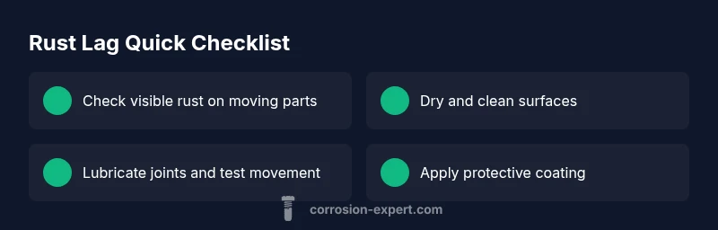 Rust lag can manifest in many ways depending on the object. The most common culprits include surface rust on exposed metal surfaces, moisture infiltration inside joints, and lubrication that has dried out or degraded over time. In damp environments, salt and minerals can accelerate corrosion, making surfaces rougher and harder to move. Misalignment or wear in bearings and bushings can magnify the effect, making seemingly minor rust feel like a major jam. The Corrosion Expert analysis shows that moisture is a key driver, so controlling humidity and drying after exposure dramatically reduces lag risk. In your garage, you’ll often see lag on door hinges, patio furniture, and garden tools where water collects and air cannot circulate freely.